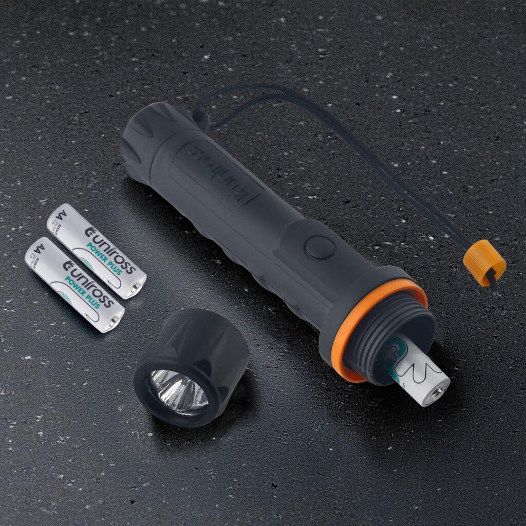 Luminează-ți aventurile cu lanterna Uniross ULFL015! Această lanternă compactă, dar puternică, oferă 15 lumeni de lumină LED puternică, cu o distanță a fasciculului de până la 20 de metri, perfectă pentru camping, drumeții, reparații la domiciliu, pescuit și activități de agrement. Construită cu o carcasă rezistentă din PVC cauciucat, este rezistentă la șocuri, la stropire (clasificare IP44) și concepută să reziste intemperiilor, cu o temperatură de funcționare de la -10°C la 60°C. Cu o durată de funcționare de 20 de ore și o durată de viață a LED-ului de până la 50.000 de ore, este partenerul tău de încredere pentru toate nevoile tale de iluminat portabil. Caracteristicile includ un mâner durabil din cauciuc, o curea de mână reglabilă și un LED indestructibil pentru o durabilitate sporită. Alimentată de 2 baterii AA (NiMH, alcaline, zinc-carbon - NU SUNT INCLUSE).